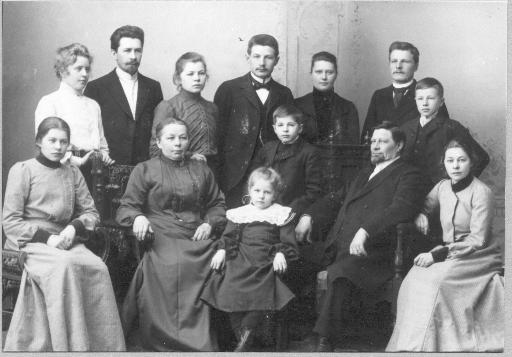 Henkilöt: Takarivissä Anna o.s. Drake (13a), Abiel (13), Aili (16), Hannes (14), Elli o.s. Kepplerus (12a), Oskari (12), Väinö (19), eturivissä Hilja (18), Augusta (1), Elsa (1B), Veikko (1A), Karl Abiel (1a), Helmi (15). Aika: noin 1901. |