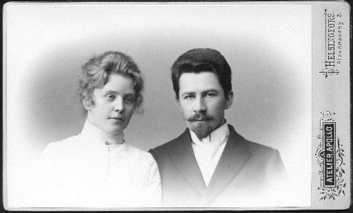 Henkilöt: Anna Heikinheimo o.s. Drake (13a), Abiel Heikinheimo (13). Aika: 14.11.1904. Paikka: Helsinki. Kuvaaja: Atelier Apollo, Helsinki. |
